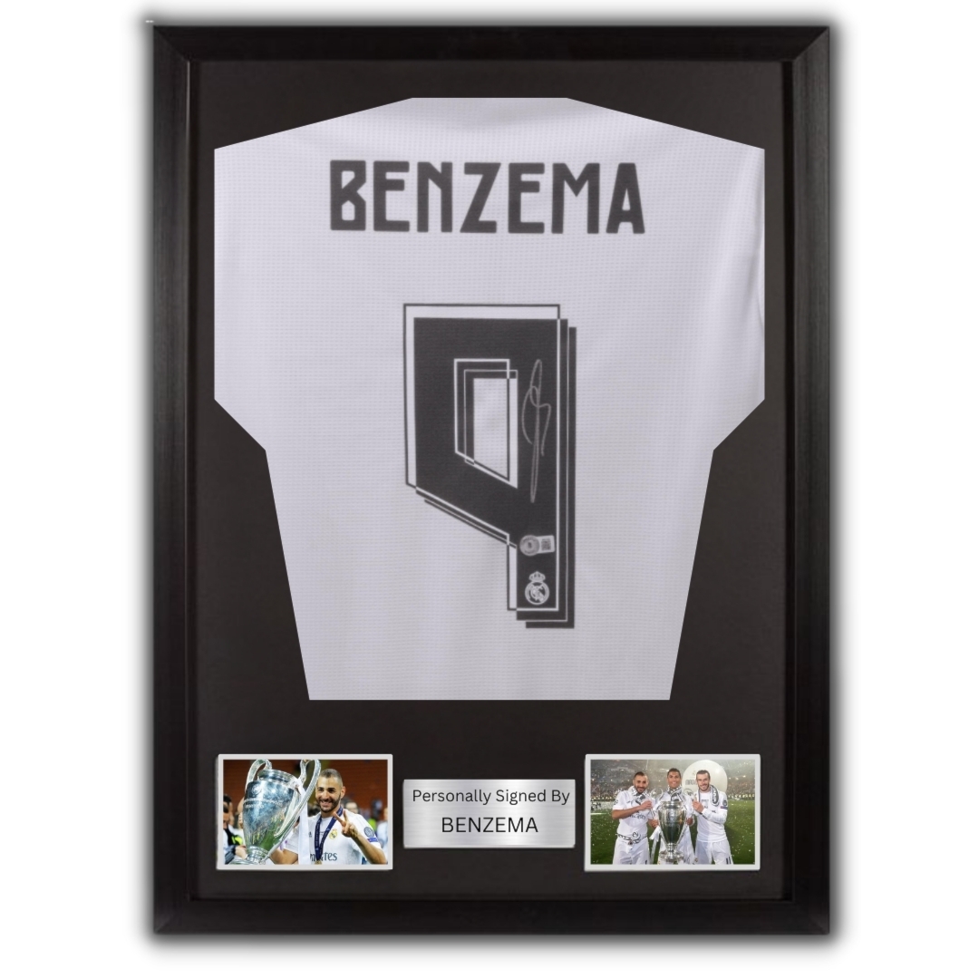 Real Madrid jersey hand signed by Benzema (with certificate of authenticity) Frame average size: 82 x 66 cm Please note that this product takes 3 days preparation + Delivery time For further information please contact @Vamos.tickets on instagram
