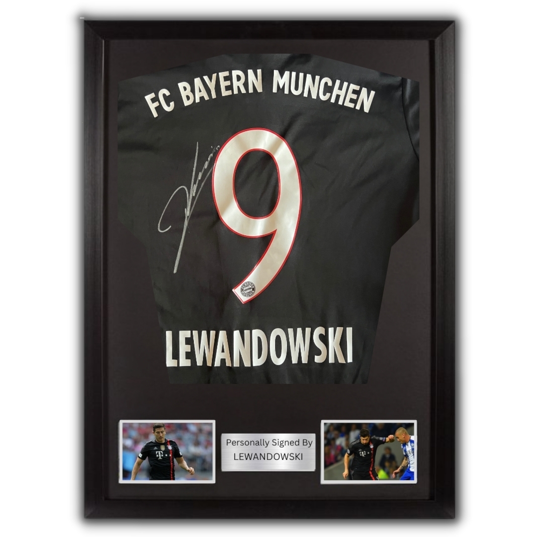 Bayern Munich jersey hand signed by Lewandolski (with certificate of authenticity) Frame average size: 82 x 66 cm Please note that this product takes 3 days preparation + Delivery time For further information please contact @Vamos.tickets on instagram