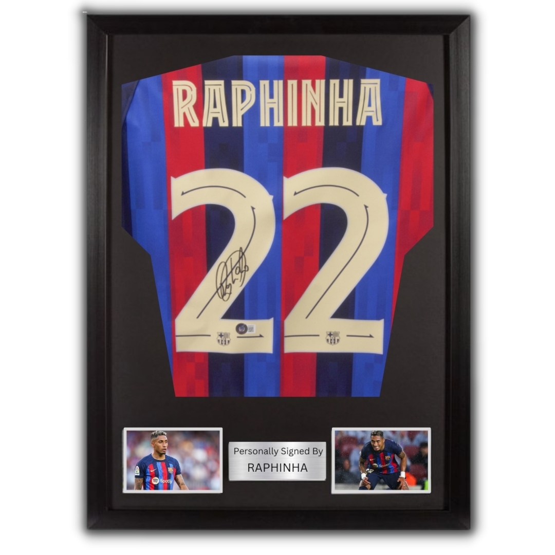 Barcelona jersey hand signed by Raphinha (with certificate of authenticity) Frame average size: 82 x 66 cm Please note that this product takes 3 days preparation + Delivery time