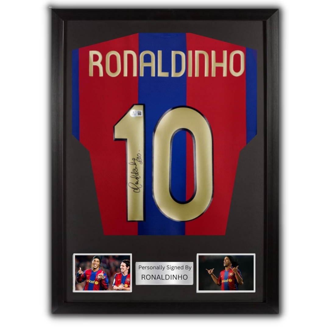 Barcelona jersey hand signed by Ronaldinho (with certificate of authenticity) Frame average size: 82 x 66 cm Please note that this product takes 3 days preparation + Delivery time