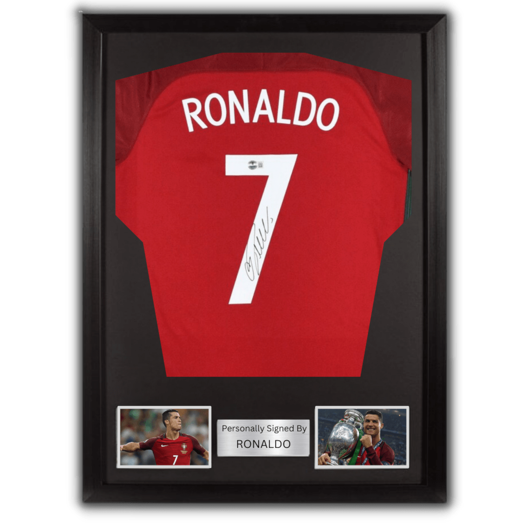 Portugal jersey hand signed by Ronaldo (with certificate of authenticity) This product comes without a frame, if you wish to add a frame you can do so by choosing Add frame before adding the product to the cart المنتج يأتي بدون برواز، وإذا رغبت بإضافة برواز كما هو موضح في الصورة يمكنك القيام بذلك عبر اختيار إضافة إطار (Add frame) قبل إضافة المنتج إلى سلة التسوّق
